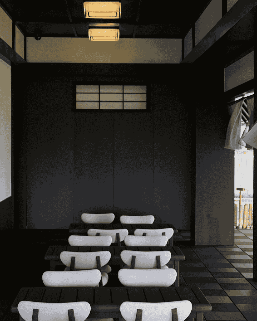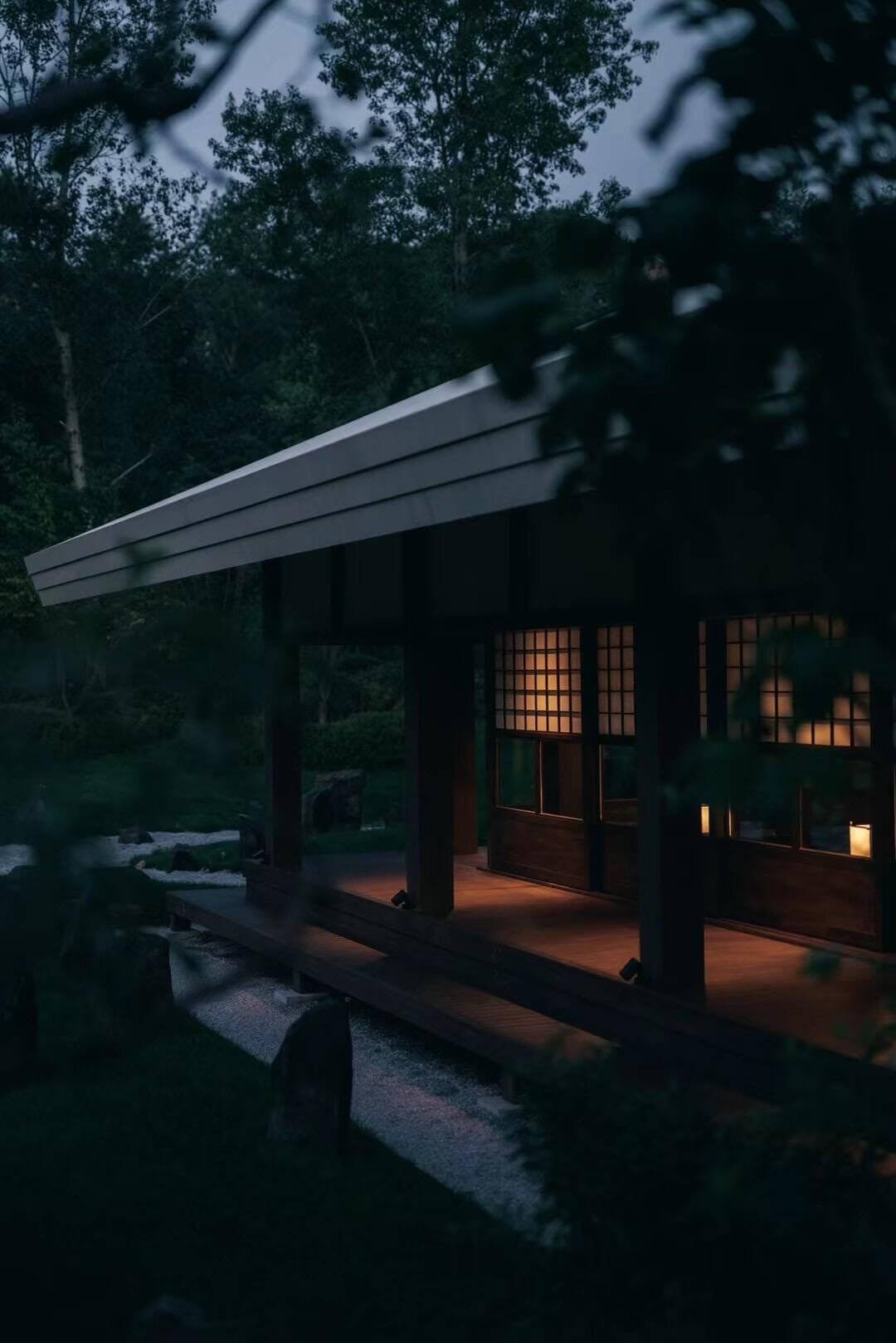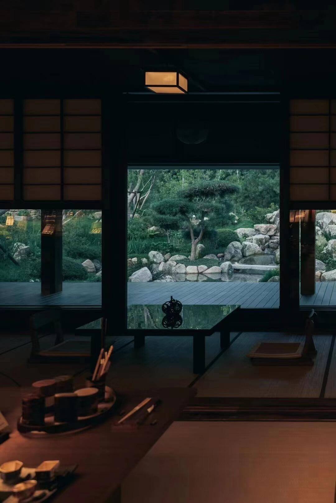 The retreat humbly embraces the riverside, its elongated rooflines and cross-shaped corridors guiding the eye through timber beams and paper lanterns. Every element—the warmth of nageshi pillars, the restraint of threshold borders, the dappled light from bamboo-edged skylights—pays homage to Song Dynasty minimalism. The pièce de résistance adjustable Song-style low windows: kneel to see a raked gravel garden unfurl like a scroll painting; stand to catch distant ridges crashing into view—a masterclass in “borrowed scenery.”